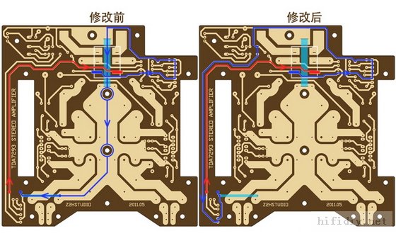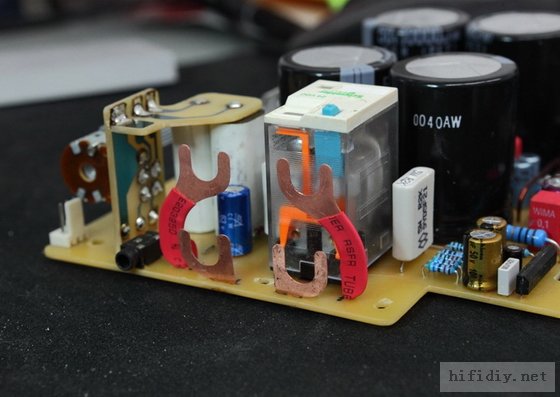 期间单独测试了喇叭保护电路,工作正常,3秒吸合。但整机测试时发现有极大的交流嗡声,后来发现是保护电路的地线走的不合理:最开始是从整流出来,正电源从板子侧边走到pc1237,负电源是用跳线直接连在放大电路的地线上,这样形成了一个大的电流环。不得已,将负电源改为借用原来给信号切换继电器供电的线路,从侧边走,这下噪音全无。