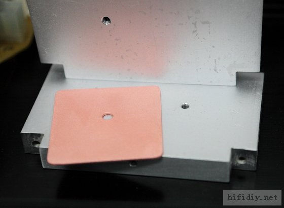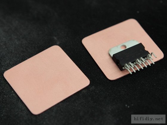 由于PCB与导热块之间有点间隙,用0.8的铜板做了个匀热。铜板用钢锯裁好尺寸,用1000号水砂纸加水打磨。然后在电路板蚀刻液里稍稍腐蚀了1分钟,出来就变成这种沙金质感了。