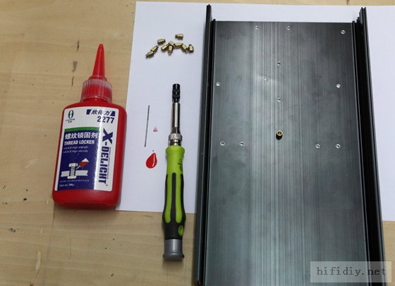 导热块是定制的,板厚10mm。块子上下两端有些加工刀痕,用钢锉修平后用水砂在平整桌面上抛光。IC安装螺孔是与PCB高度对好,然后画点,用2.5mm钻头打孔,然后M3丝锥攻丝。螺口边按常规方法,用大号钻头轻轻转几下倒角。