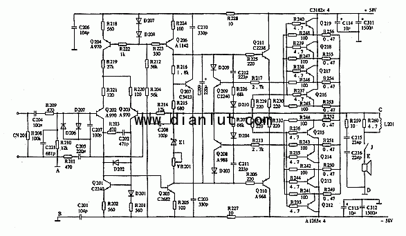 上面说的雅马哈EMX2300功放维修时就是采用上述方法第一步通电试机时,发现中点C、D间电压偏高,且推动管Q210、Q211发热冒烟。立即停机,对电路元件反复进行检测、对比,均未发现损坏变质元件。后来对照原理图仔细核对电路,发现差分输入级Q202的基极上偏流对地电阻R210未与地线直接相接,而是通过插头座与调音台地线相连,再与电源的地端构成回路。而在通电试机时,为了方便,未与调音台相连,致使差分放大级Q202失去偏置电压,差分放大器失去平衡,经直接耦合,造成输出端中点(C、D间)电压偏高,烧毁互补大功率对管Q212~Q219。直接将R210接地线A与功放地线B相连,并对可能假焊虚接的与调音台相连的插座进行补焊后,再按照第一步通电试机,中点电压恢复0V,且调节输入端电压中点电压稳定。