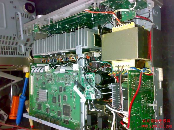 天龙AVC-2310功放是2009年上市的一款中端产品,售价约6千。拆机观察内部结构紧密,硕大的一张解码板看起来像是电脑主板一样布满了大大小小的芯片。通电后接通交流开关,待机5伏电压正常,启动待机键,听到继电器响,显示屏亮,操作正常。输入数字信号,有识别显示,但是没有听到输出继电器吸合的声音,那么是什么原因呢,是相关电路保护还是继电器供电电路有问题?测量了全部有标识的电压都正常,解码板下面还有一张电路板,看起来要拆了检查非常麻烦,为了不走弯路,不浪费不必要的精力,决定先从电路图入手,通过查阅电路图发现,输出继电器的供电是单独由一只7824提供,测量7824的输入输出电压都正常,那会不会是保护呢,根据操作功能正常、数字信号识别正常来判断,不像也不应该。于是打算从7824输出电压端理一理24伏的去向,这时才发现,7824输出的三根线是用插头插在7824引脚上的,轻轻一拉就掉了,试着将插头重新连接好,开机约五秒后听到一声清脆响亮的吸合声。声音恢复正常。由此故障可以分析出,老烧们在购买功放的时候要看产地还是有一定道理的,在国内加工的机器生产工艺供似乎还是要差一些,这是国人不愿意相信却又不得不承认的事实。更多天龙AV功放维修请联系渝成音响维修网。